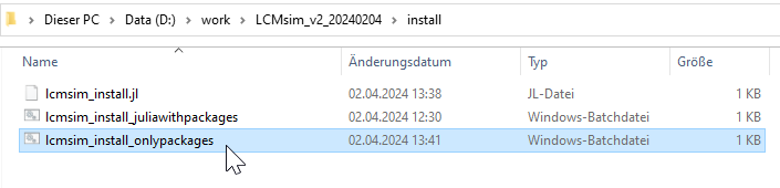 - Extract, change to install folder and double click on the batch file to install the missing Julia packages (or alternatively install Julia and all the packages):