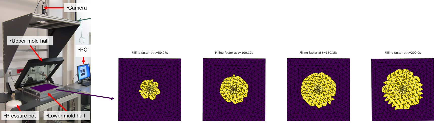 During pre-processing the physical domain (i.e. the mold cavity) must be transfered to a numerical domain (i.e. the mesh), initial and boundary conditions must be assigned to the cells of the mesh. The simulation is started with a set of process parameters and a set of material parameters. The solver calculates how the values of the physical quantities in the cells change in the course of the filling. Different physical models of the filling can be implemented in the solver. The physical models have to describe all relevant issues of the filling process. During post-processing the resin flow front at different time instances must be visualized as contour plots.